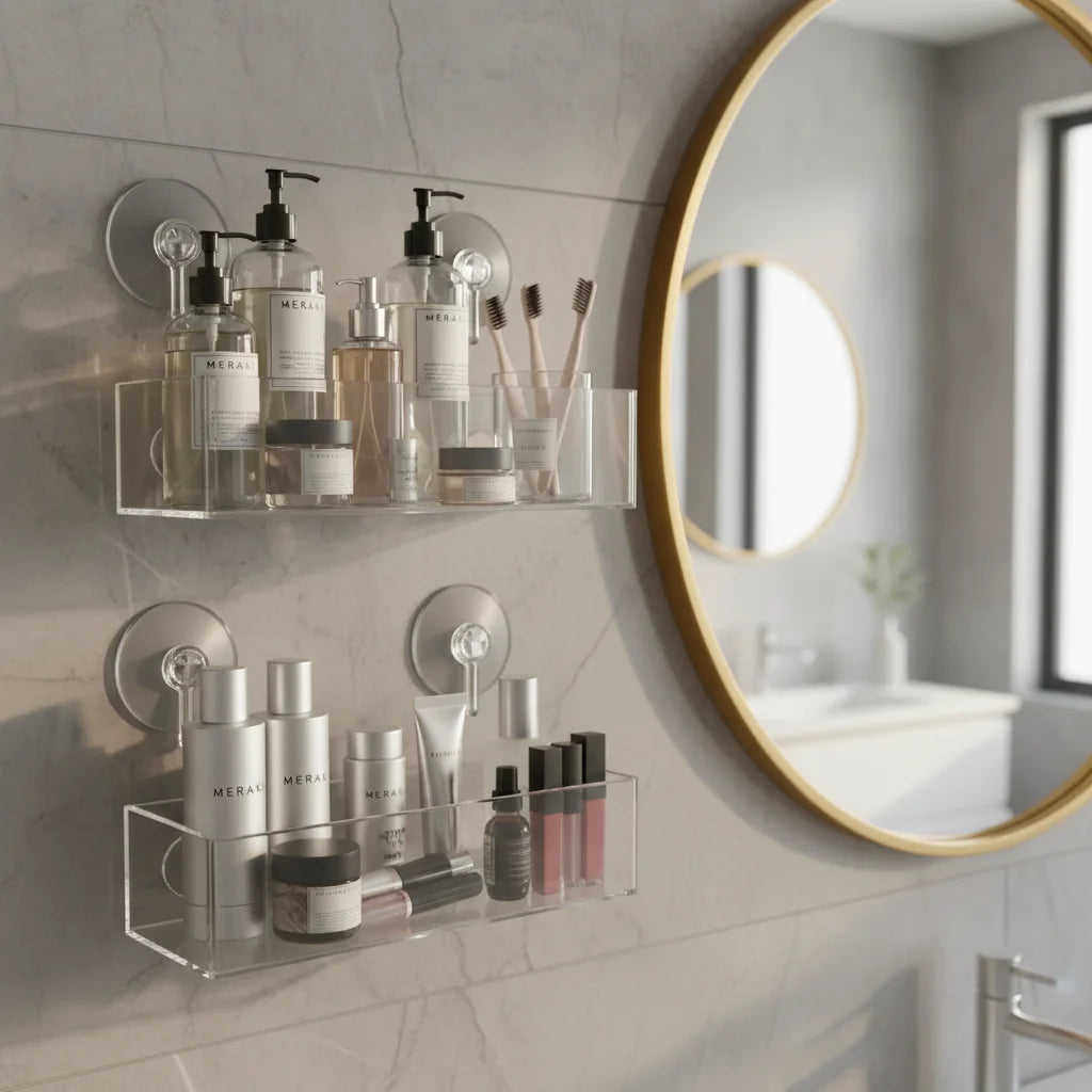 Imaginez ce coin qui ne sert à rien. Nos boîtes transparentes et élégantes le transforment, sans percer. Vos produits essentiels sont à portée de main, l'espace est optimisé, et votre salle de bain respire la modernité. Malin, non ?